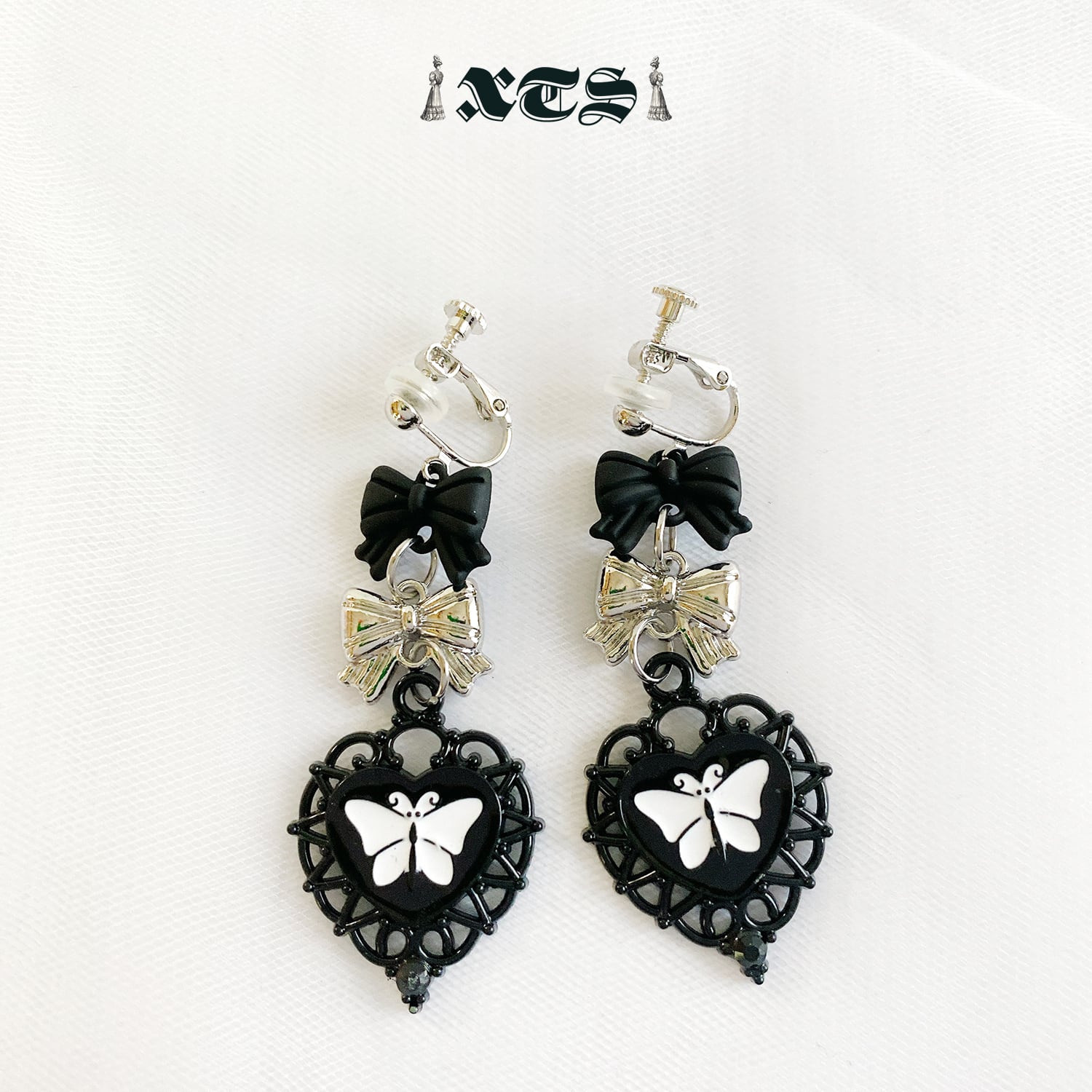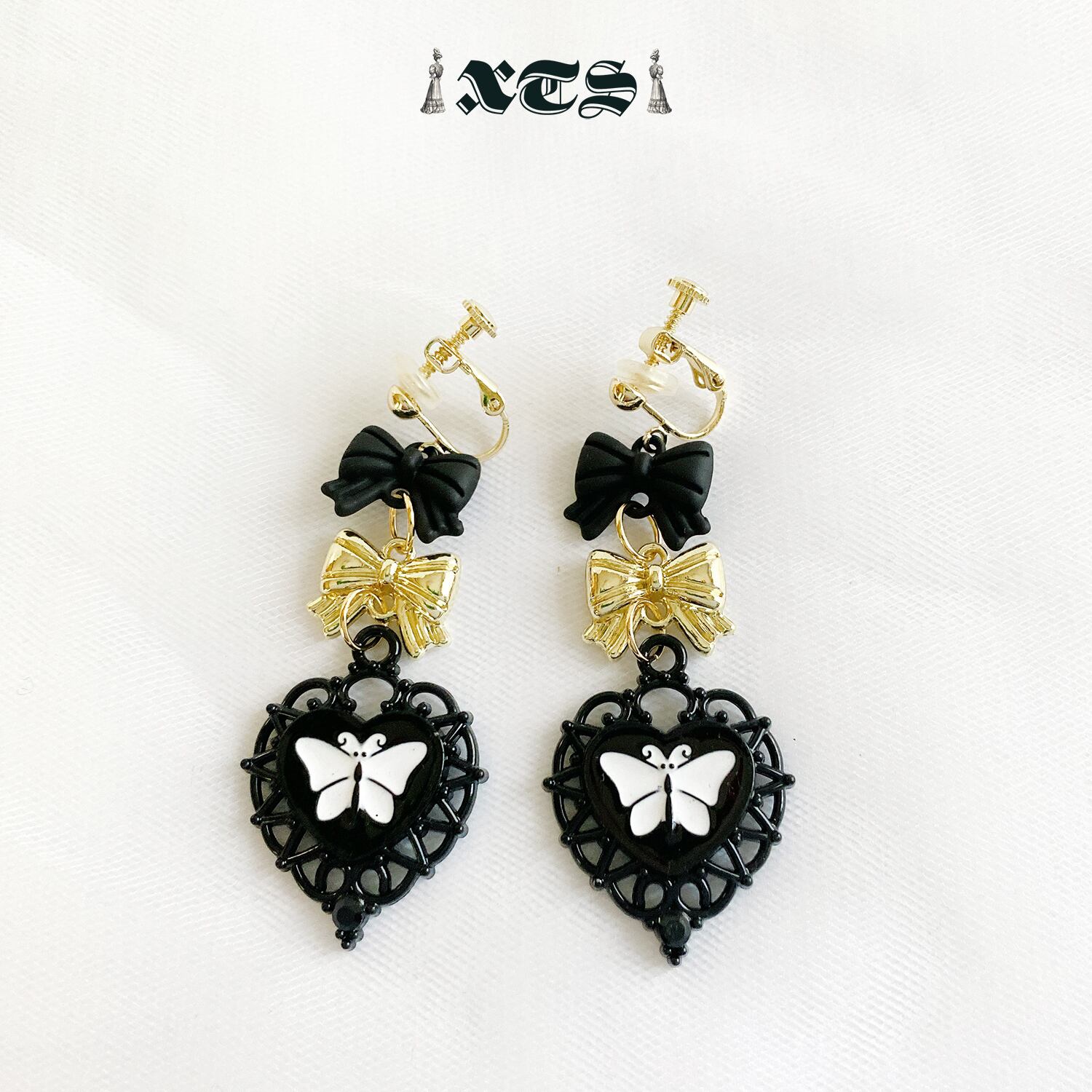 ゴシックなブラックハートバタフライイヤリング。