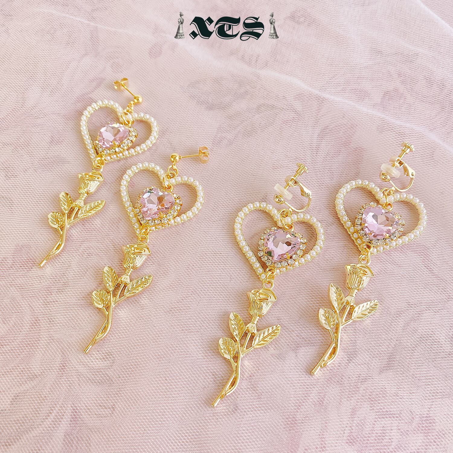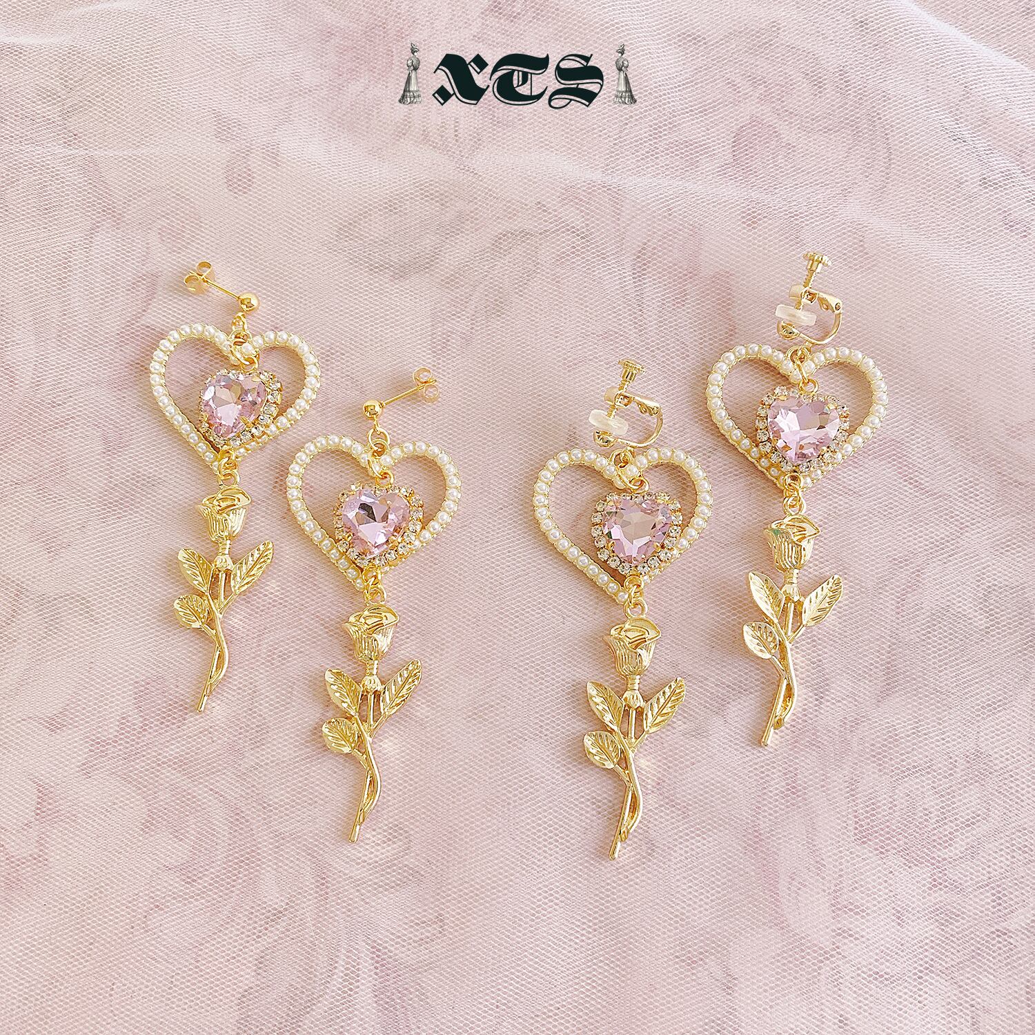 ハートパールにピンクハートのビジュー、そしてローズチャームがゆらゆらと揺れるキュートなピアス。