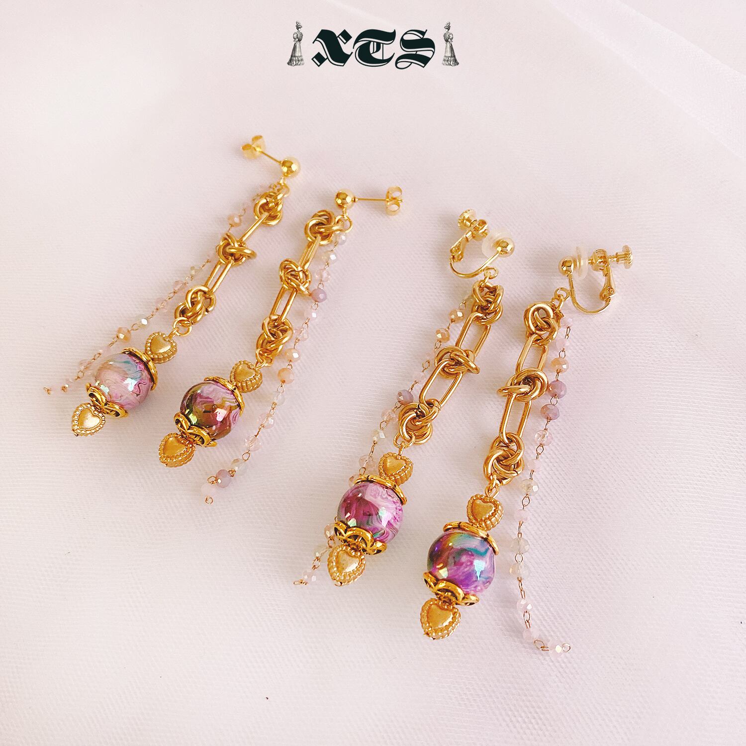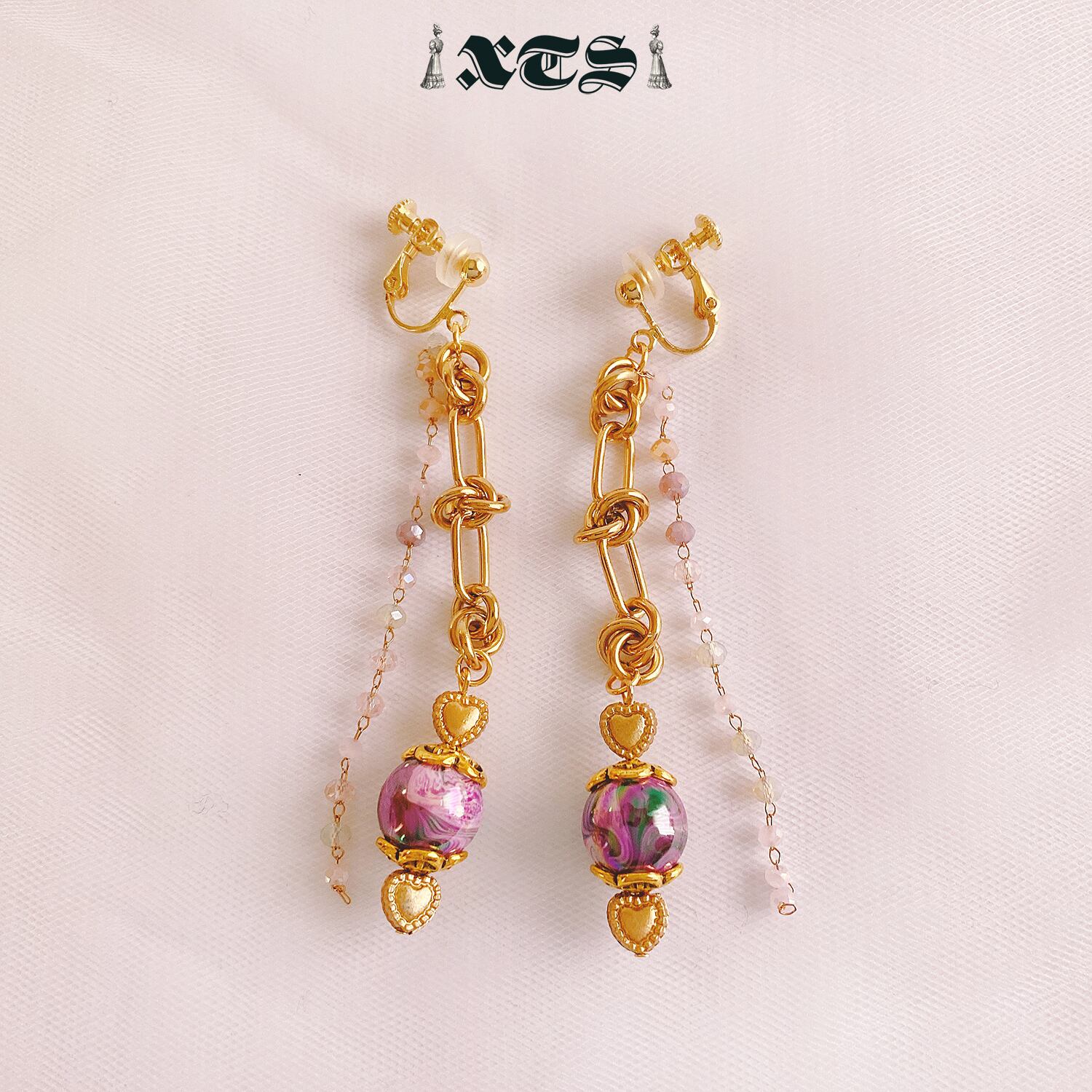 パープルマーブル柄ビーズにマットゴールドのミニハートビーズがキュートなチェーンイヤリング。