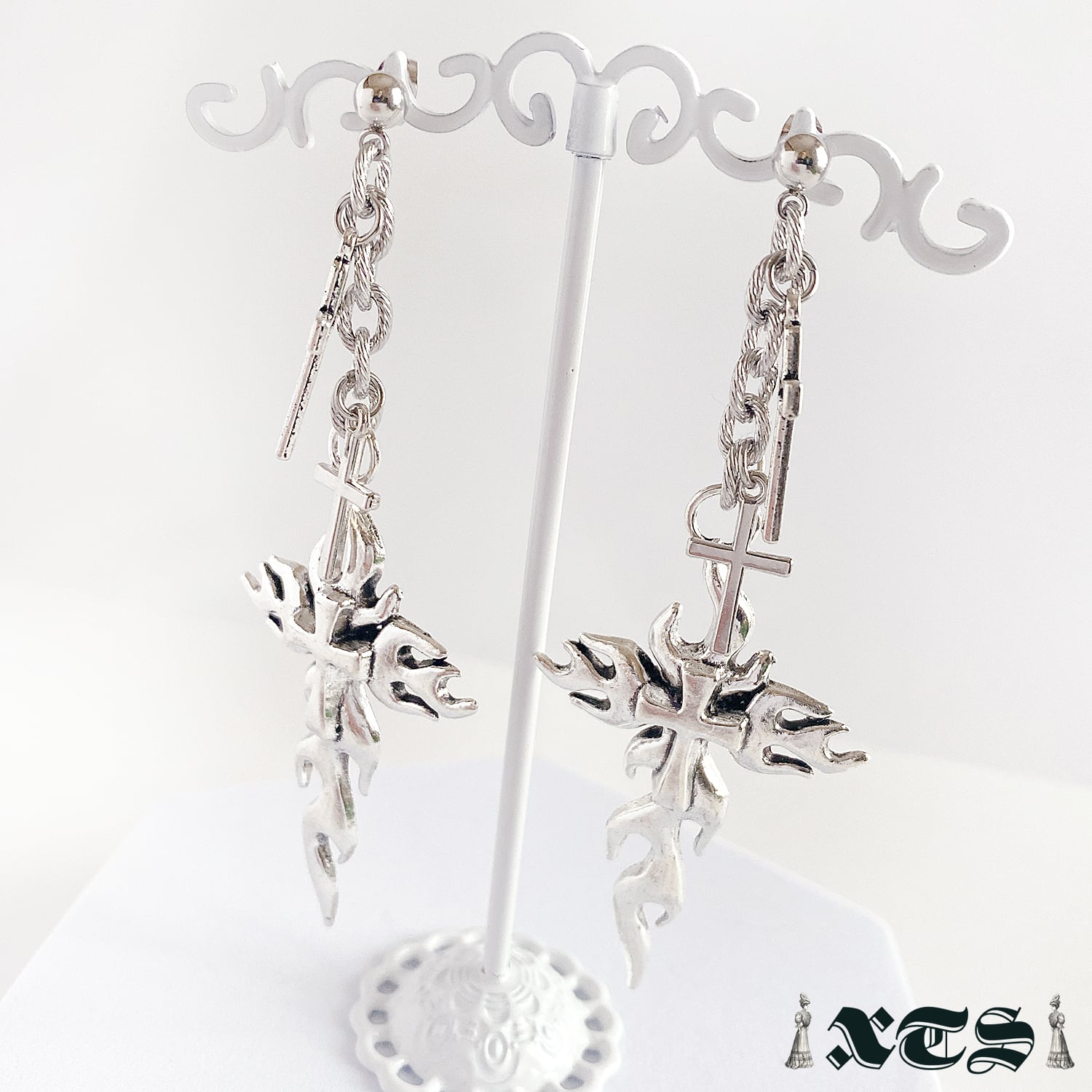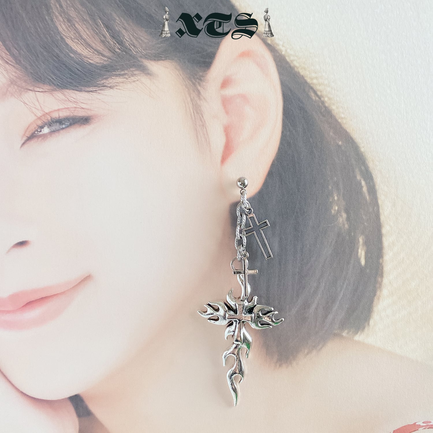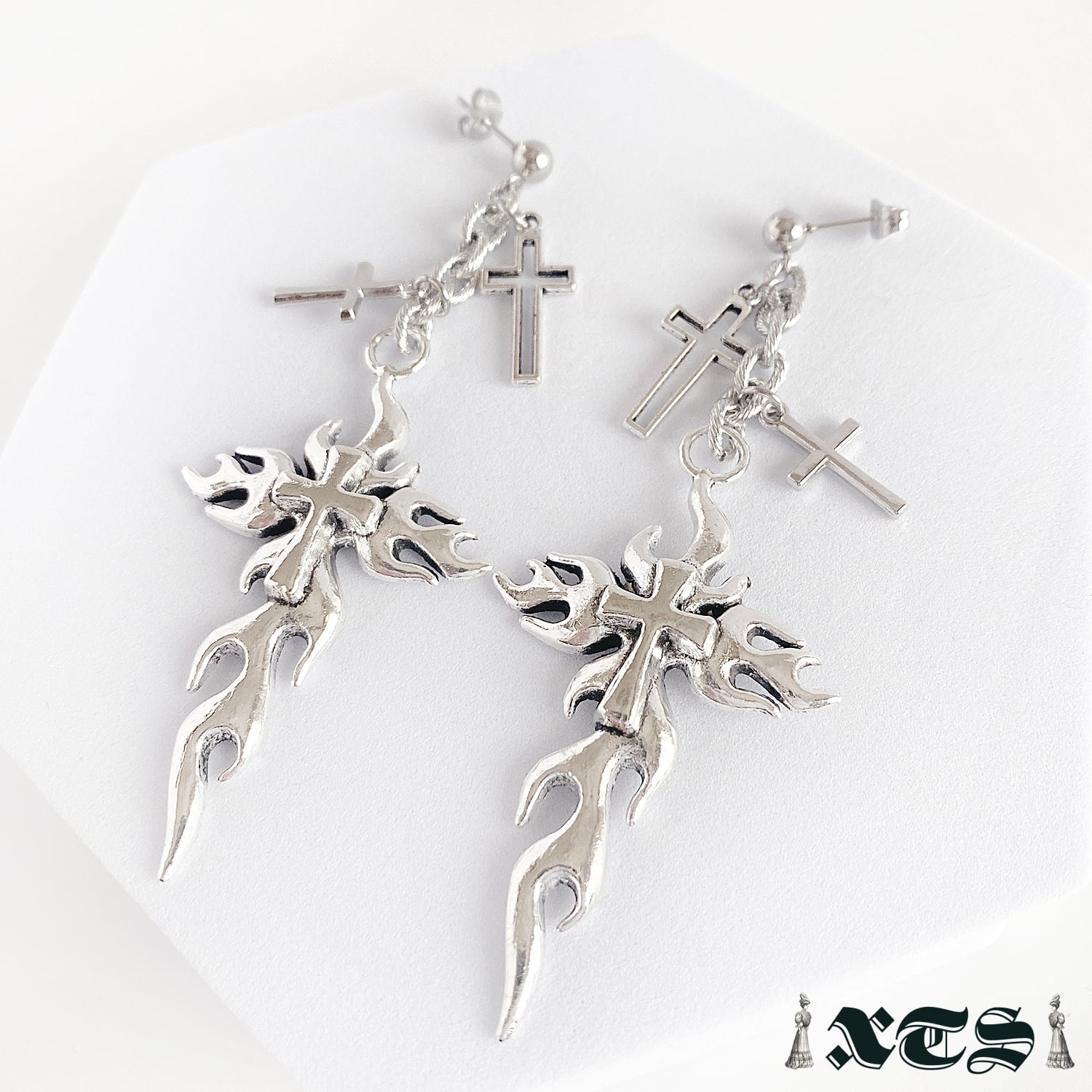 ファイヤークロスの大きめチャームと透かしクロスなどのチャームがクールなピアス。