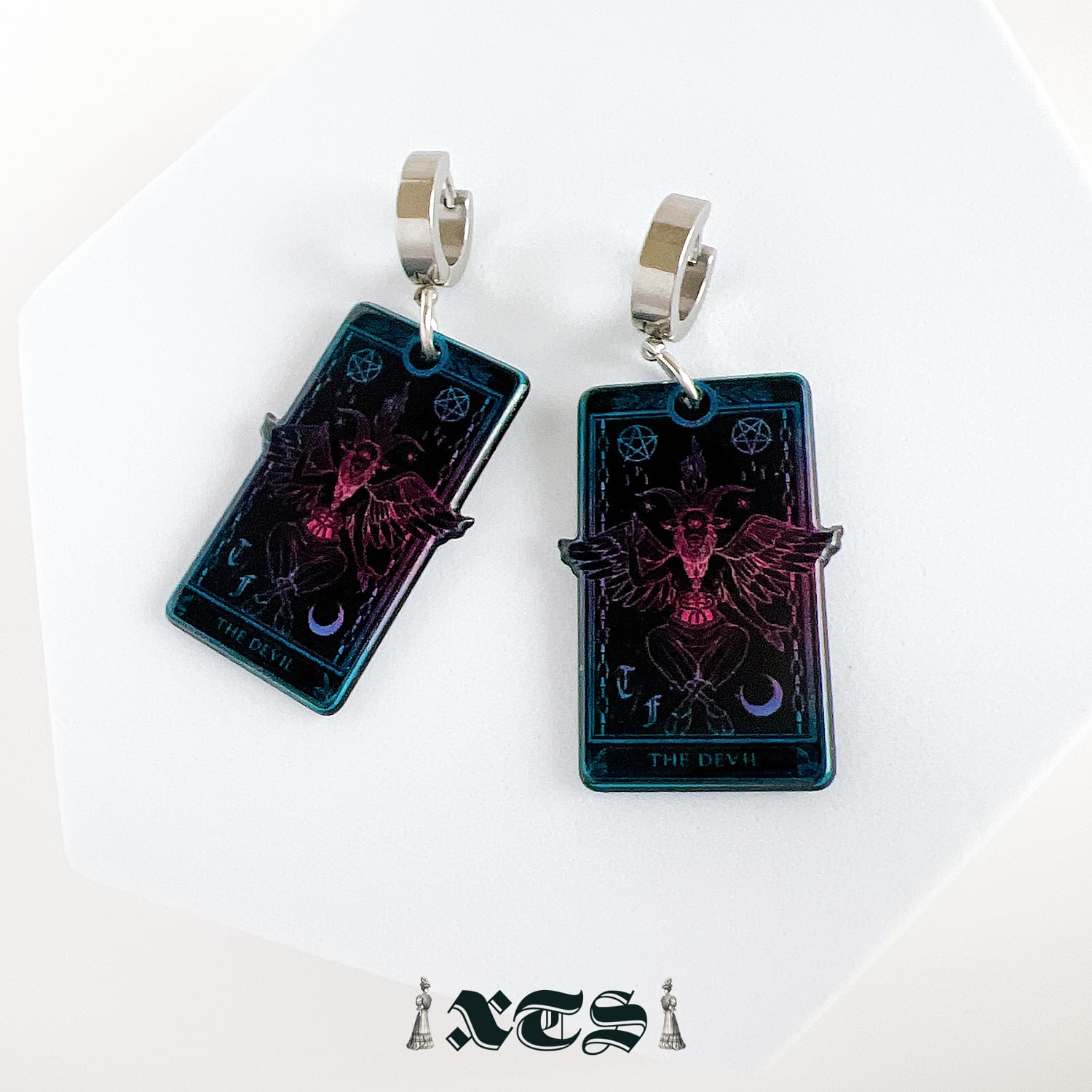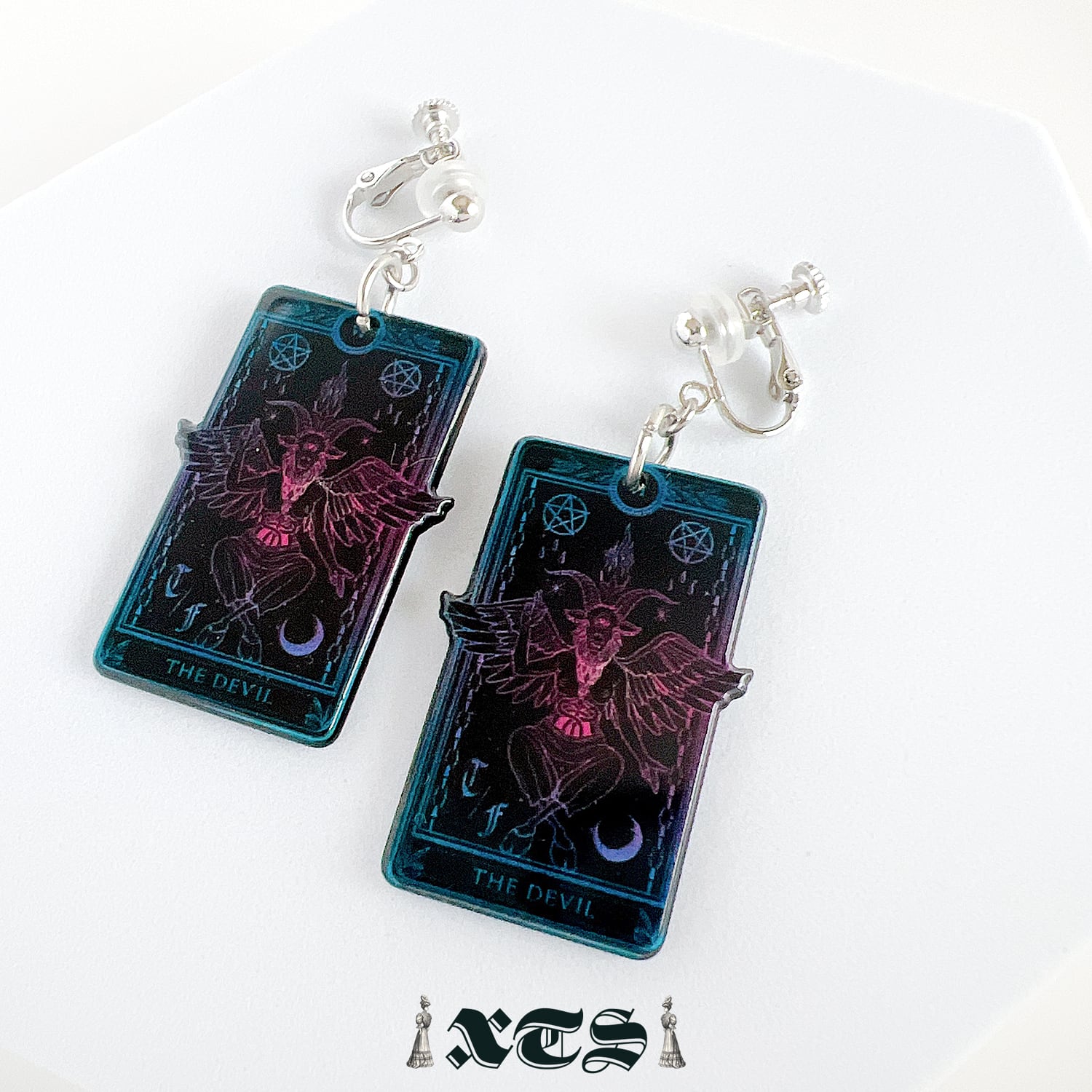 ブラックカラーにブルーとピンクのグラデーションカラーでバフォメットが描かれたタロットカードデザイン。