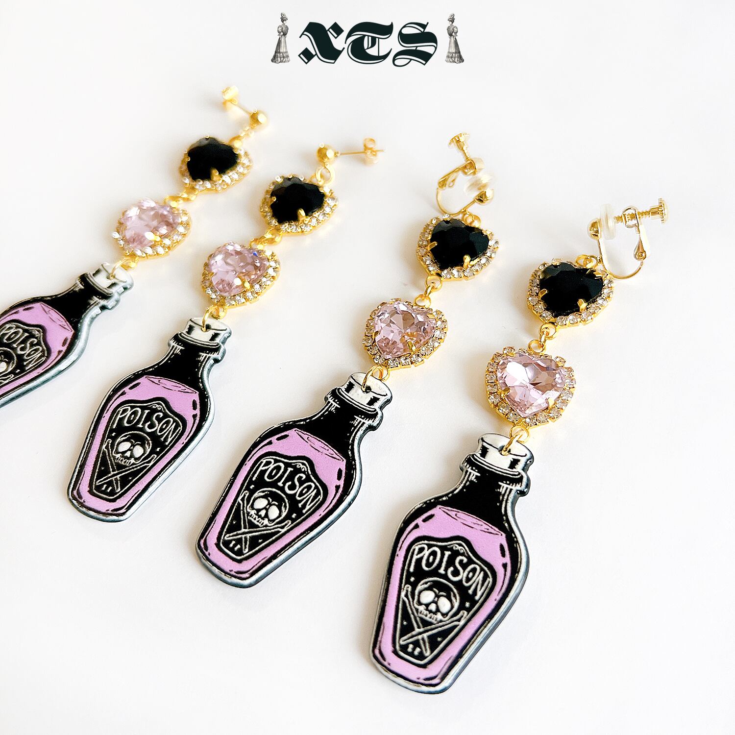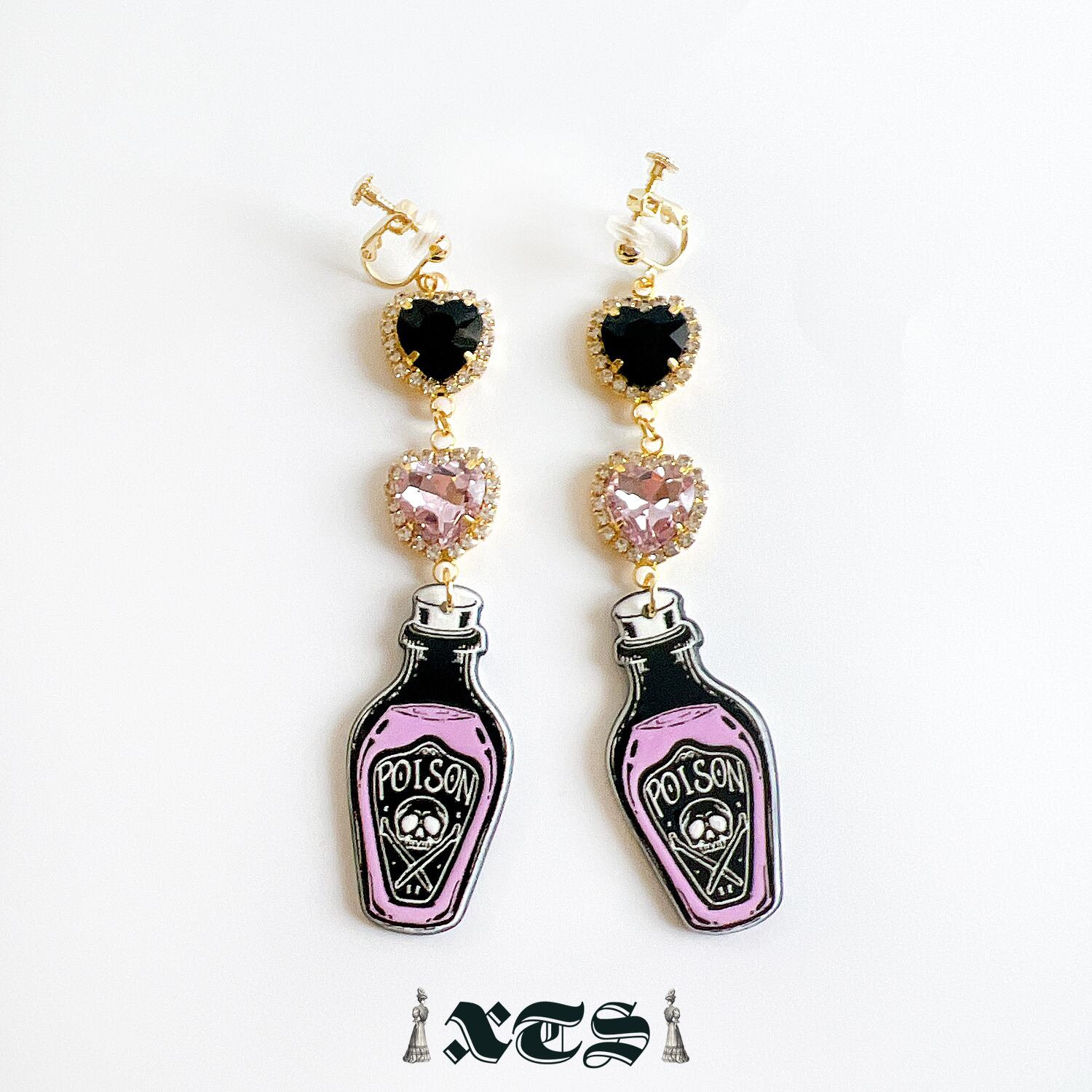 ブラックとピンクのハートビジューにポイズンボトルが組み合わされたキュートなデザイン。